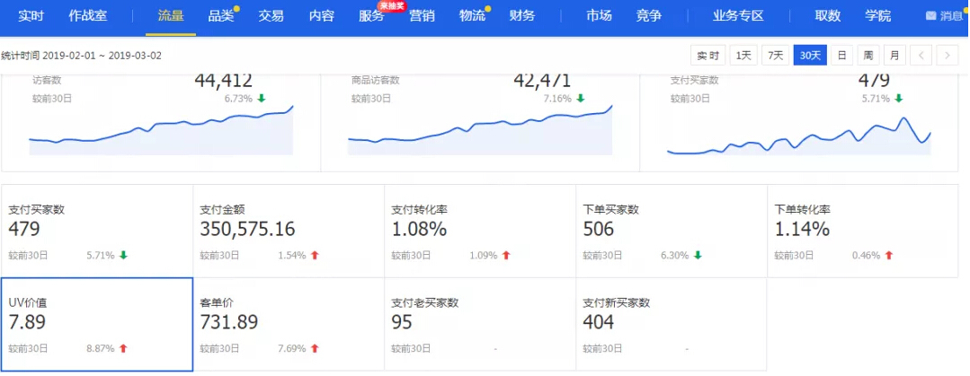 7. 然后再计算自己所在层级的优秀数据和平均数据,这个只能看单品维度,配图是生意参谋后台的截图,在生意参谋-流量-UV价值,可以看到自己的UV价值,以及和你同行同层优秀以及平均的UV价值。