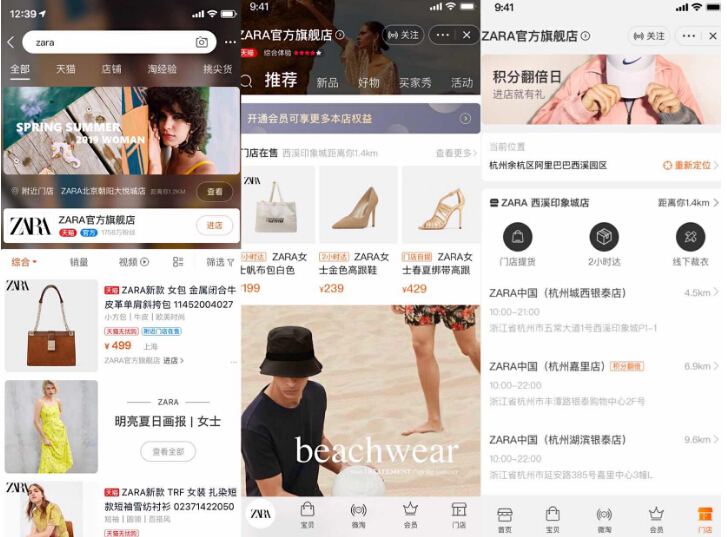 另外,天猫旗舰店2.0还会让消费者的线下线下购物体验更加丰富。比如,当消费者进入升级后的ZARA官方旗舰店,能看到有哪些商品属于线下门店在售、哪些线下门店距离他最近,以及附近线下各门店提供的特色服务。