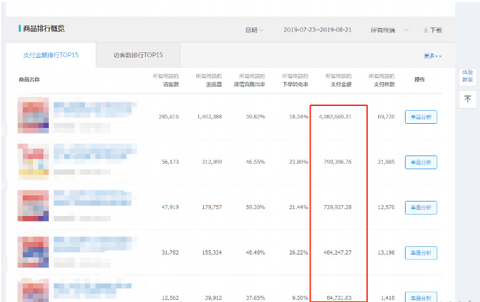 第二种方式,我们通过生意参谋商品排行概览数据累积,15天或者一个月左右,看单款的转化率以及收藏加购件数,如果基数大,转化不错,这样的款有足够的利润空间,后面通过直通车持续放大。