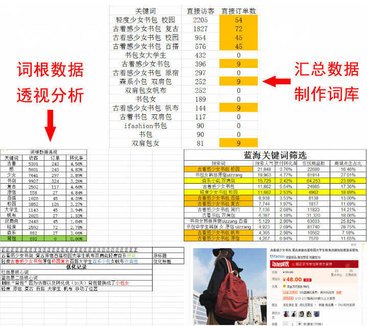 在这里可以看到每一个词根的访客,销量数据,通过表格数据透视清晰明了剖析了每个词根转化率(收藏加购率也可以制作)。