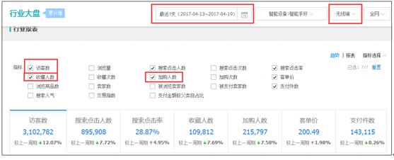 打开生意参谋——市场行情——行业大盘,选好你的子类目,最关键的是你要注意数据维度:选最近7天的数据。一天的数据偶然性太大,30天的数据又周期太长,可能会受季节性因素的影响。另外,还有很重要的一点,就是你必须要注意一些特殊的时间点,比如大促前,收藏和加购占比一定是比较高的,这都属于特殊的时间点。
